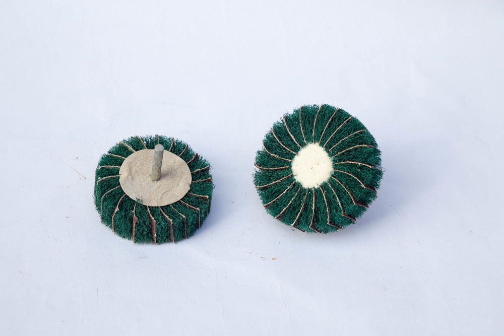 百潔布磨頭(百潔布與棕剛玉或鉆剛玉頁片交替以1:1的比例)呈放射狀地排列在木心之外,磨削能力極佳。處理后工件的表面線條均勻一致,散熱良好,不燒傷工件,從而降低研磨成本,提高工作效率